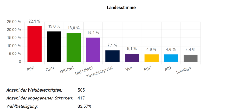 An unserer Schule haben die Jahrgangsstufen 7 bis 12 erfolgreich an der Juniorwahl teilgenommen. Die Juniorwahl dient dazu, die aktuelle Landtagswahl in Rheinland-Pfalz zu simulieren. Organisiert wurde das Projekt von den Schülerinnen und Schülern des Sozialkunde LKs der 11. Klasse mit der Unterstützung ihres Lehrers Herrn Pörtner. Die Durchführung verlief reibungslos und stieß auf großes Interesse. Besonders erfreulich ist die hohe Wahlbeteiligung von 82,57%. Von insgesamt 505 Wahlberechtigten haben 417 ihre Stimmen abgegeben. Dies zeigt das große Interesse der Schülerschaft an politischen Prozessen. Anbei die Ergebnisse der Zweit- bzw. Landesstimme: